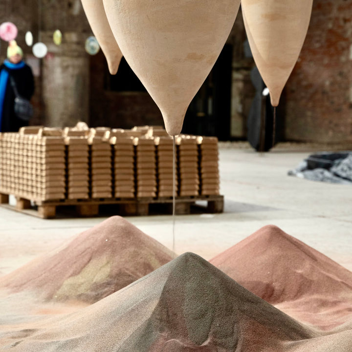 CO-Lapses (2023-24) is Karma Barnes’ sculptural installation bringing together ten elegant, organically-shaped, clay and pigment pods suspended from the ceiling. Each vessel holds fine sand mixed with pigment local to places in Bundjalung Country, Australia, or Venice, Italy. Simultaneously, all ten softly sculpted forms release a slender stream of coloured sand onto the floor, slowly forming ten peaked, miniature mountains, referencing ancient relationships between bodies and the land. The installation as a whole calls to mind the passage of deep time, as well as Earth’s biological and social systems. Co-Lapses poetically reminds us that the interconnectedness of our planet’s inhabitants extends beyond human perception and boundaries, and that our world is co-created, through human-nonhuman and other-than-human relationships.