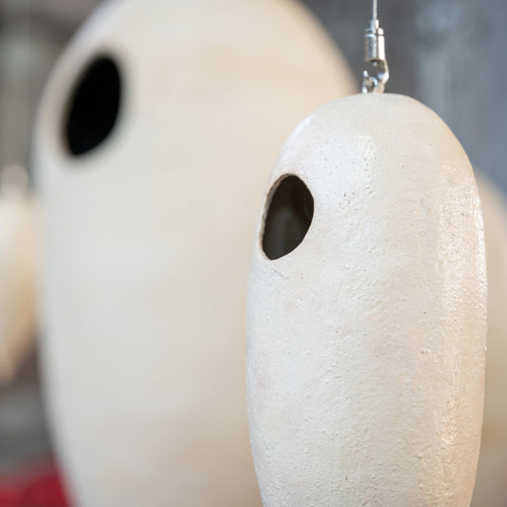 The artist’s aesthetic choices and textual concerns in Co-Lapses are visually abstracted and beautifully simplified. They embrace the natural world and seek to mirror the essence and vitality of human immersion in nature. Originally, Barnes’ motivation for the work emerged from observing mud wasps building their nests in her studio: the tiny earthen capsules they constructed on walls and ceiling were multi-coloured red and yellow ochred, due to the insects’ taking pigments from her collection. As such, Co-Lapses is a poetic translation of the wasps’ design strategies for protecting the eggs they lay. Here, Barnes’ interest in biomimicry – the practice of translating nature’s strategies into the world of human designs for problem solving, and the creative application of natural systems and processes toward human solutions – comes to the fore. The pods share a material affinity (unanimity) with the earthen pigments falling to the ground, and with the multi-tiered nests built from layered mud by female mud dauber wasps. In a similar sense, considering both micro and macro scales, the iron in our blood is the same element as that bound up in an extra-terrestrial meteorite falling to Earth. Our contemporary understanding of the universe relies upon the identification of the one hundred and eighteen elements of the periodic table. Such material unity informs our sense of wholeness and interconnection. Co-Lapses brings to mind this unity by mirroring the integral, material cohesion of the cosmos.