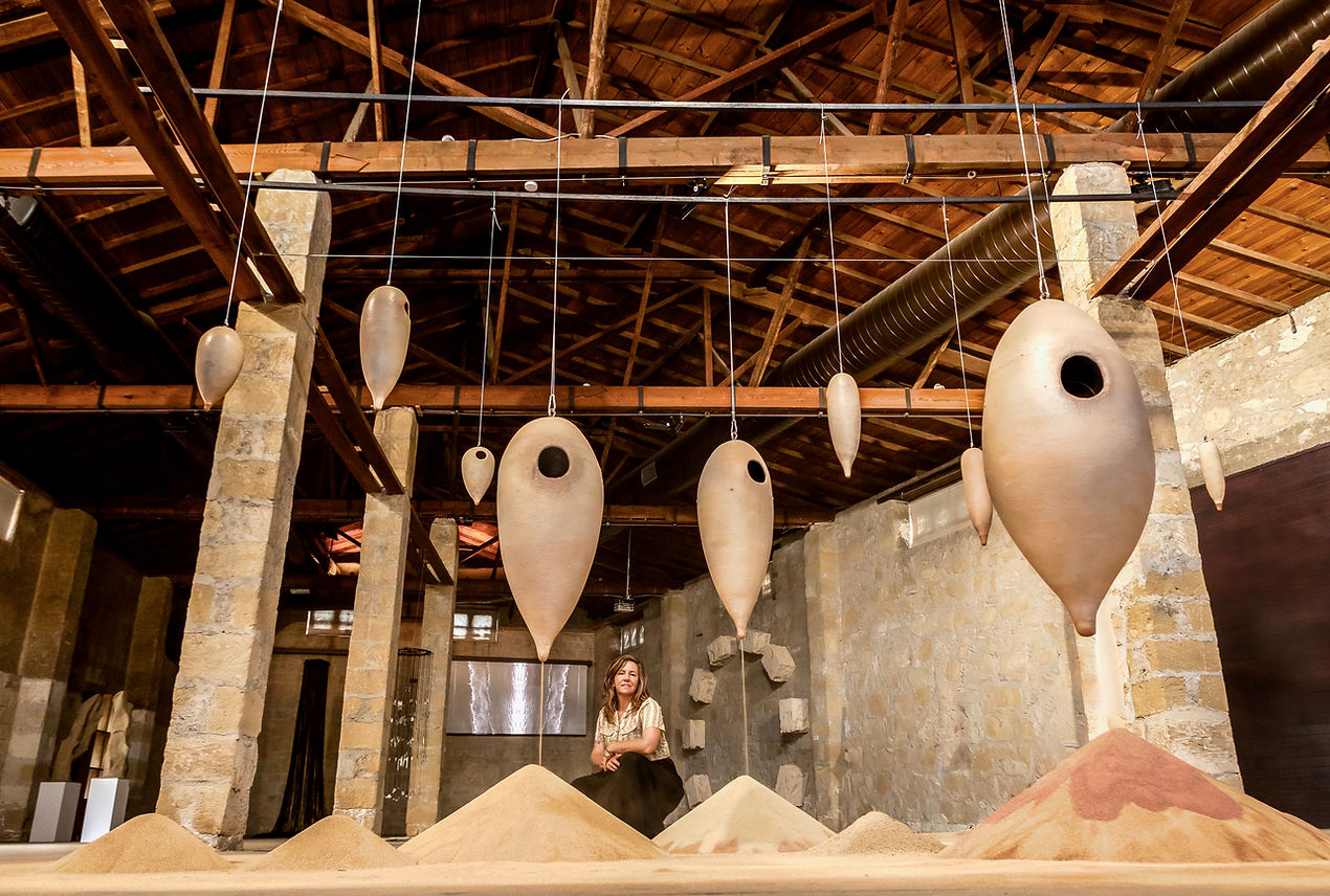 Barnes’s award-winning installation CO-Lapses is an upscaled interpretation of the miniature mud architectures built by wasps that inhabit her studio. Using 31 earth pigments and oxides locally sourced from Cyprus, she constructed suspended vessels that slowly release fine layers of limestone sand and.pigment. Over time, the work evolves as a living system, its flows and accumulations tracing cycles of erosion, renewal, and material memory.