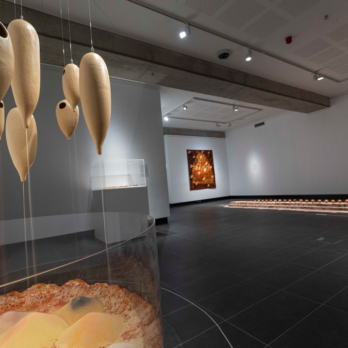 The resulting artworks in Relative Terrains are a reflection of their research and experiences. The large-scale installations and suspended paintings are produced in a range of mediums, including locally sourced pigments, which are used to create a connection between the artwork and the land.